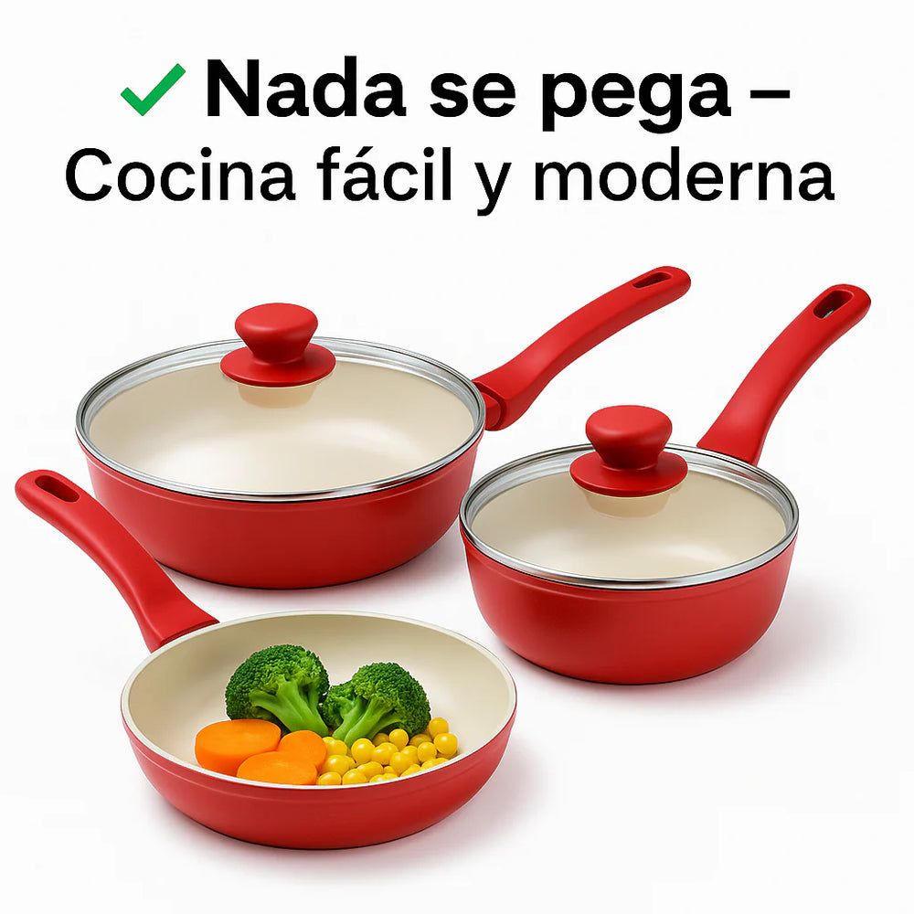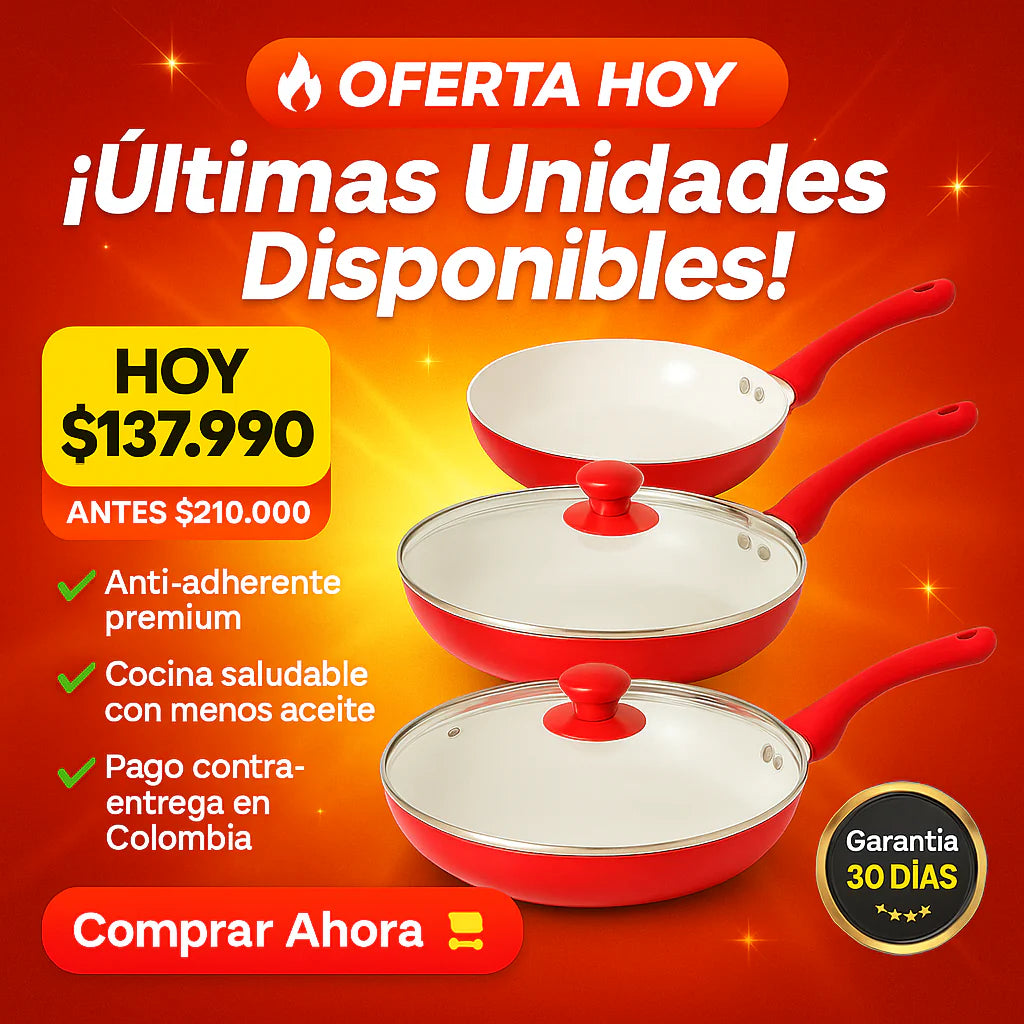 Olvídate de los sartenes rayados que hacen de la cocina un problema. Con este set, cada comida será más fácil, más sana y con un estilo que hará brillar tu cocina. Y lo mejor: lo recibes en casa con envío rápido y pago contraentrega en toda Colombia. ¡Aprovecha el precio especial de $137.990 (antes $210.000) y transforma tu manera de cocinar hoy mismo!