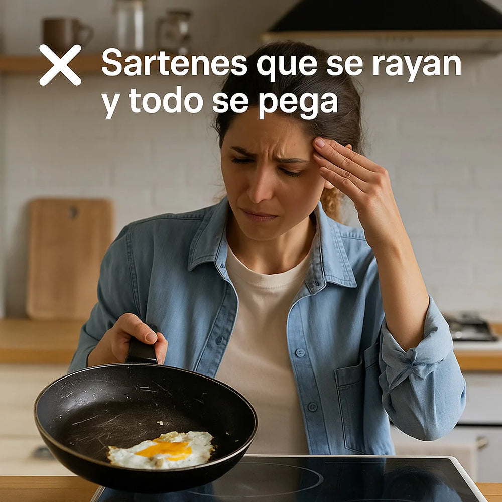 Nada se pega y usas menos aceite. Lava en minutos sin esfuerzo y cocina más saludable para tu familia.
